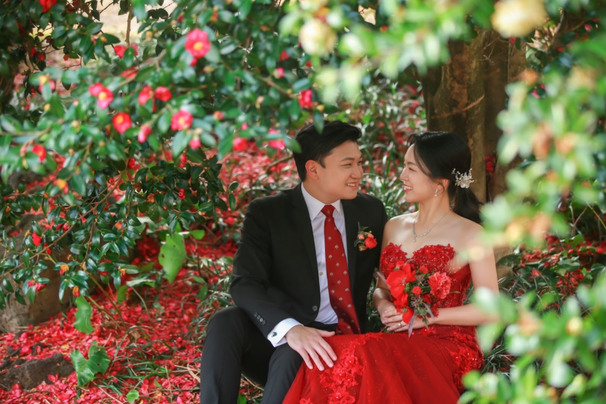 During spring, the soft pink cherry blossoms harmonise beautifully with the vibrant red camellias, making it an exceptional choice for couples seeking diverse floral aesthetics in their wedding photography.