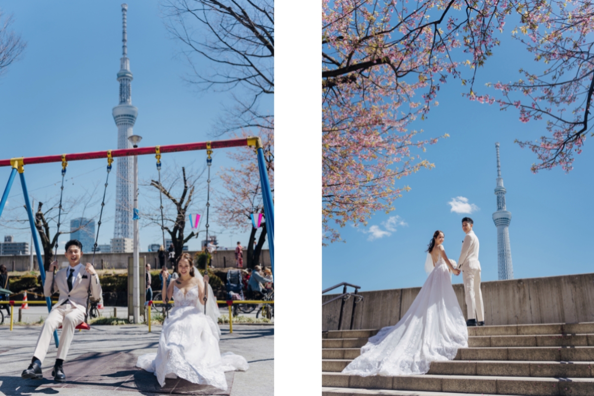 Located along the Sumida River, this park offers a mesmerising view of cherry blossoms with Tokyo Skytree in the background. The riverbanks are lined with sakura trees, making it a picturesque spot for a pre-wedding shoot.