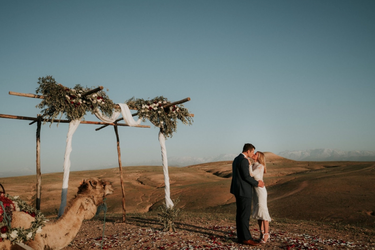 A camel ride across the Moroccan desert is a once-in-a-lifetime experience that adds a sense of adventure and culture to your shoot. Dressed in flowing outfits and perched atop majestic camels, couples can create iconic silhouettes against the sunset. It’s perfect for storytelling—symbolising a romantic journey into forever. Many couples choose to wear Berber-style scarves or capes for added flair. Whether in the Sahara or Agafay, camel rides instantly elevate the drama and emotion of your shoot. They also provide fantastic candid moments between posed shots.