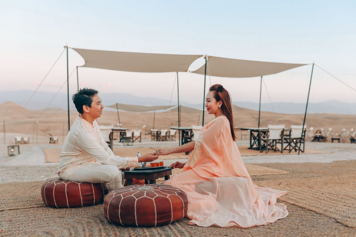 Desert glamping in Morocco offers a magical and luxurious setting for your pre-wedding photoshoot. Picture this: a private tent with plush decor, lanterns lighting the pathways, and star-filled skies above. You can capture intimate moments on Moroccan rugs, in front of fire pits, or under ornate canopies. The blend of wilderness and comfort creates an unforgettable atmosphere. Many glamping camps are styled specifically for photography, making it easy to find the perfect angle. It’s a top choice for couples who want boho-chic desert elegance.